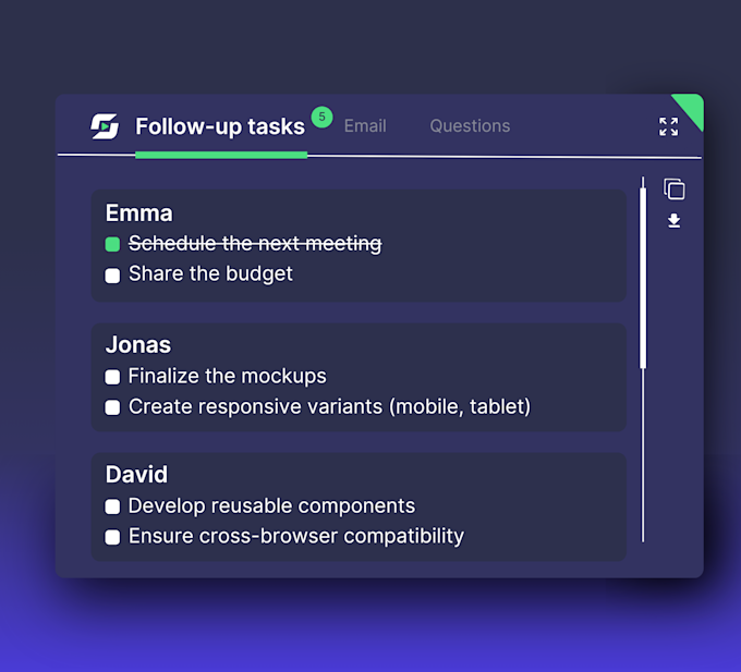Once your meeting is over, a detailed report is automatically sent to you, including the next tasks and their assignment to the appropriate individuals.